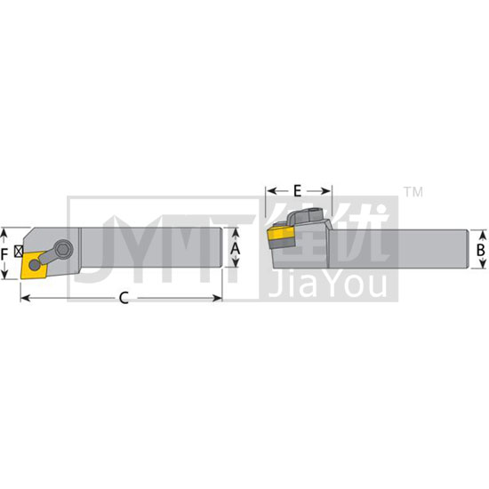 符號說明:A - 柄B - 切削刃高度C - 全長E - 刀頭長度F - 刀頭寬度