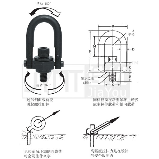 A: 半徑B: 環(huán)寬D: 環(huán)厚E: 螺紋長度F(±.0.60): 環(huán)高G: 每英寸上直徑和螺紋頭數(shù)C: 核定載荷